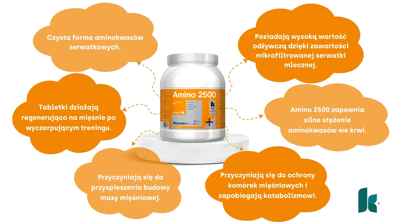 Aminokwasy Amino 2500 mają wysoką wartość odżywczą dzięki mikrofiltrowanej serwatce najwyższej jakości. Są bardzo aktywne biologicznie i mogą przyspieszać budowę mięśni nawet kilkukrotnie, dając Ci natychmiastowy efekt anaboliczny (wzrost siły i masy mięśniowej). Aminokwasy serwatkowe zawarte w Amino 2500 zapewniają silne stężenie aminokwasów we krwi, dzięki czemu organizm ludzki może liczyć na dostateczną podaż budulca do budowy mięśni. Jednocześnie chronią komórki mięśniowe i zapobiegają katabolizmowi (rozpadowi) białek mięśniowych po treningu.