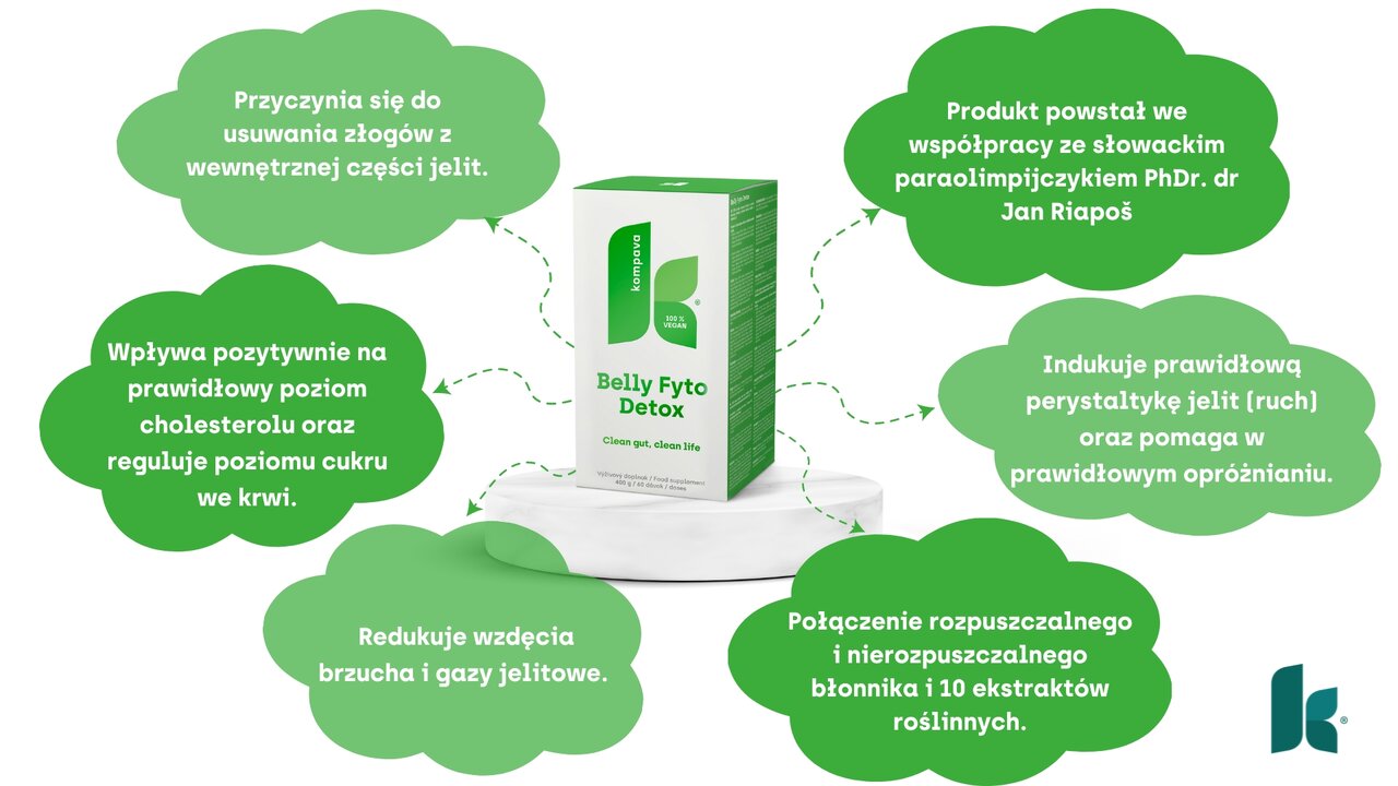 Belly Fyto Detox to naturalne połączenie rozpuszczalnego i nierozpuszczalnego błonnika, który wiąże szkodliwe substancje w procesie trawienia, eliminując w ten sposób ich kontakt z śluzówką oraz wchłanianie do krwi i tkanek. Przyczynia się do usuwania złogów z wewnętrznej części jelit spowodowanych niezdrowym stylem życia, czyli oczyszcza jelita. Błonnik rozpuszczalny tworzy z wodą żel, który spowalnia procesy trawienne, zapewniając tym samym dłuższe opróżnianie żołądka i lepsze wchłanianie składników odżywczych. Wpływa pozytywnie na prawidłowy poziom cholesterolu oraz reguluje poziomu cukru we krwi.