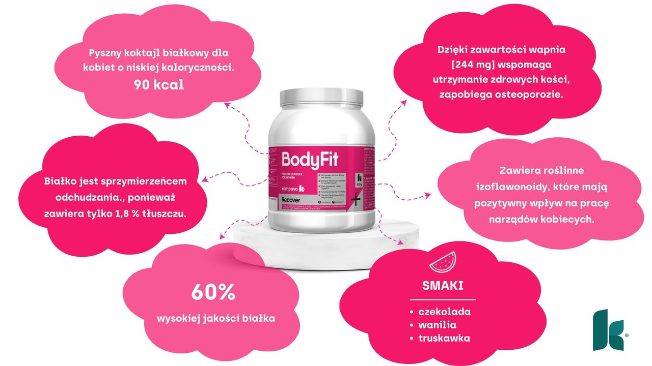 Niezależnie od tego, czy biegasz, jeździsz na rowerze, chodzisz na fitness czy gimnastykujesz się w domu, BodyFit zadba o harmonię Twojego kobiecego organizmu. Białko BodyFit to świetny suplement dla każdej aktywnej kobiety, której celem jest utrata wagi i zbudowanie szczupłej linii. Ma niską wartość kaloryczną (90 kcal), zawiera tylko 1,8 % tłuszczu i jest wzbogacony L-karnityną, która odgrywa ważną rolę w spalaniu tłuszczów w organizmie oraz ich przemianie w energię.