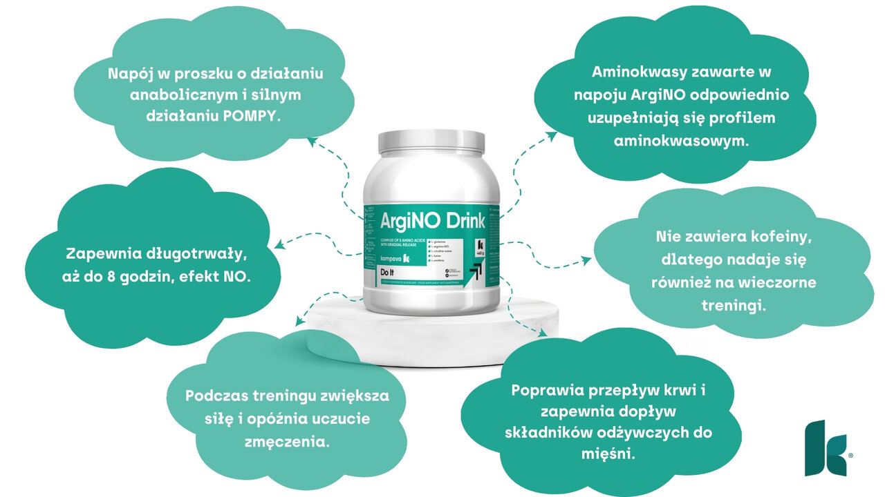 Odżywki przedtreningowe pomagają zwiększyć energię, wytrzymałość i wydajność podczas treningu, aby osiągnąć lepsze wyniki. ArgiNO Drink to mieszanka aminokwasów, które opóźniają uczucie zmęczenia, dostarczają składników odżywczych, budują i regenerują mięśnie. Zawiera mieszankę aminokwasów, które mają na celu poprawienie pompy mięśniowej. Prekursorem tlenku azotu (NO) jest L-arginina, która reguluje rozszerzenie naczyń krwionośnych, poprawia przepływ krwi i dostarcza mięśniom składniki odżywcze. Efekt ten potrzebny jest podczas treningu do pobudzenia mięśni. Litrulina i ornityna są przekształcane w organizmie w argininę, dostarczając w ten sposób 8-godzinny efekt PUMP. Nie zawiera kofeinę i dlatego jest zatem idealną przedtreningówką dla osób trenujących nawet wieczorem.