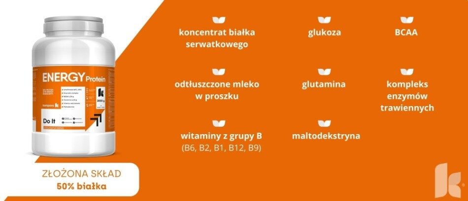 Wzbogacony jest o substancje anaboliczne takie jak L-glutamina i BCAA, które są niezbędne do wzrostu masy mięśniowej, ochrony i regeneracji mięśni po ciężkich treningach. Zawarty w ENERGY Protein kompleks enzymów poprawia wchłanianie składników odżywczych oraz zapobiega wzdęciom.