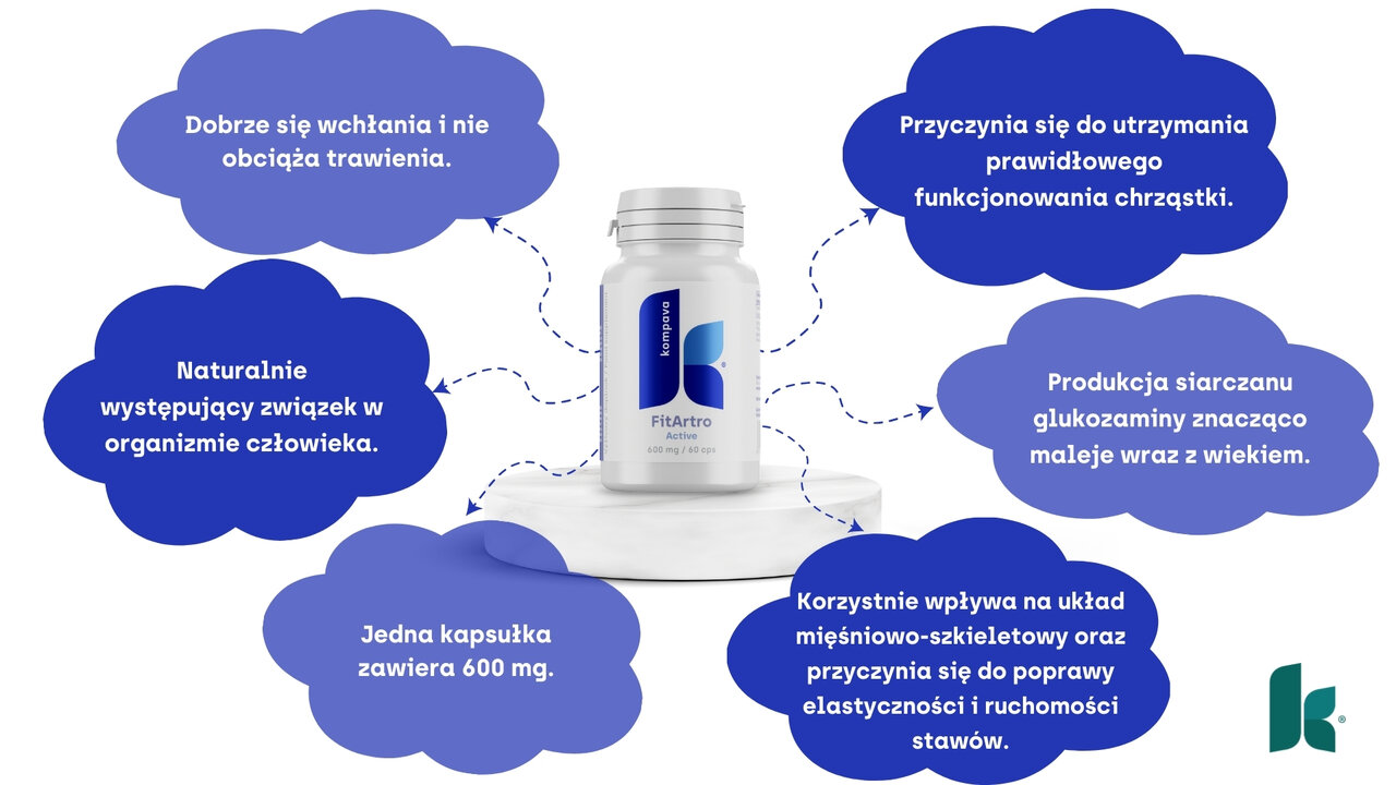 Fit Artro Active zawiera czysty siarczan glukozaminy, który jest samoistną substancją organizmu i jest głównym składnikiem chrząstki. Siarczan glukozaminy powstaje naturalnie w organizmie człowieka, ale wraz z wiekiem jego produkcja znacznie spada. Jego rolą jest stymulowanie aktywności komórek chrząstki (chondrocytów) w tworzeniu elementów budulcowych chrząstki (glikozoaminoglikanów i proteoglikanów). To jest najważniejsza substancja, od której możesz zacząć, aby chronić swoje stawy i więzadła. Jest wysoce przyswajalny i nie obciąża trawienia, korzystnie wpływa na układ mięśniowo-szkieletowy oraz przyczynia się do lepszej elastyczności i ruchomości stawów.