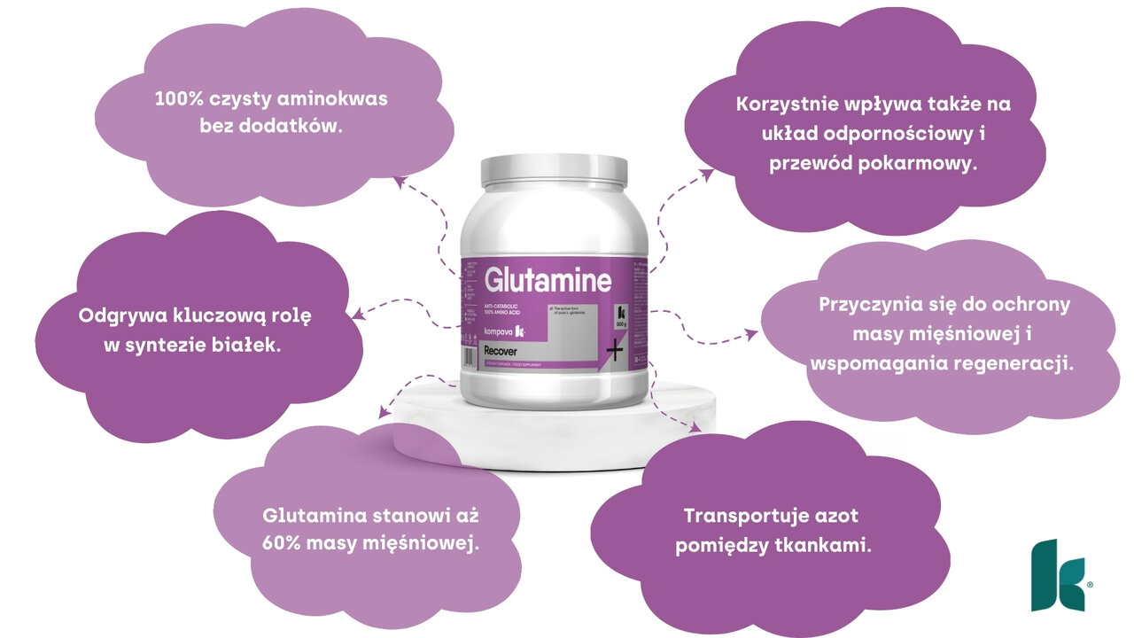 Nasz organizm potrafi sam wytworzyć L-glutaminę, jednak często zdarza się, szczególnie u aktywnych sportowców, że potrzeby organizmu przewyższają jej produkcję. Nie należy zapominać, że aktywni sportowcy mają długotrwale obniżoną odporność. Efektem może być zwiększona podatność na choroby wirusowe, zwłaszcza podczas grypy i epidemii. Glutamina jest kluczowym źródłem energii dla szybko dzielących się komórek, takich jak komórki układu odpornościowego, w tym limfocyty i makrofagi. Podczas stresu lub choroby zapotrzebowanie na glutaminę może wzrosnąć, co prowadzi do jej zwiększonego wykorzystania przez komórki odpornościowe. Glutamina jest również ważna dla utrzymania integralności błony śluzowej jelit, która odgrywa kluczową rolę w obronie przed patogenami i wspieraniu ogólnej odporności. Glutamina występuje naturalnie w żywności, takiej jak mięso, ryby, produkty mleczne i rośliny strączkowe. W żywieniu sportowców glutamina jest często stosowana w celu wspomagania regeneracji i poprawy wyników.