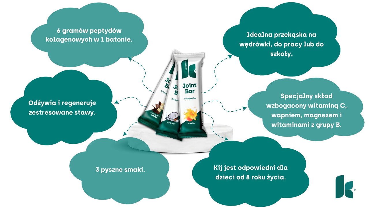 Baton kolagenowy Joint Bar zawiera specjalną mieszankę peptydów kolagenowych, witamin i minerałów, które wzmacniają i regenerują stawy. Peptydy kolagenowe stanowią sygnał dla organizmu do wytworzenia własnego kolagenu. Kolagen jest podstawowym budulcem chrząstki stawowej, więzadeł oraz ich elastyczności i siły.