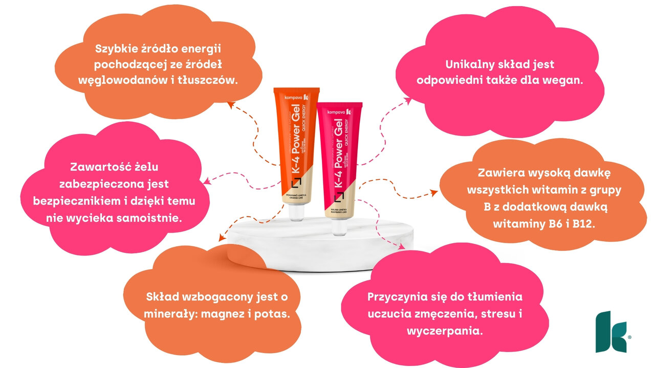 K-4 Power Gel to szybkie źródło energii pochodzącej ze źródeł węglowodanów i tłuszczów (tłuszcze MCT). Charakteryzuje się wysokim „efektem NO” (działaniem wazodylatacyjnym). Efekt ten zapewniają aminokwasy L-arginina i cytrulina. Skład wzbogacony jest o minerały: magnez i potas, które biorą udział w prawidłowej pracy mięśni podczas wysiłku. Tauryna działa stymulująco, dzięki czemu wspomaga wytrzymałość i opóźnia uczucie zmęczenia.