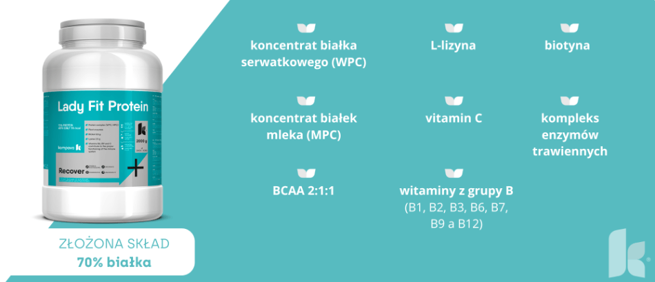 Lady Fit Protein składa się z wysokiej jakości koncentratu białek serwatki i mleka. Kompleks białkowy wzbogacony jest enzymami trawiennymi, dzięki czemu białko jest łatwo przyswajalne – nie powoduje problemów trawiennych, wzdęć czy wzdęć. Jedna dawka zawiera aż 5,52 g BCAA, które wspomagają regenerację mięśni. Dbanie o swój wygląd to także pielęgnacja włosów i paznokci, dlatego do Lady Fit Protein dodaliśmy biotynę, która przyczynia się do utrzymania ich zdrowia. W zdrowym ciele zdrowy umysł. Aby wesprzeć Twoje zdrowie, dodaliśmy do Lady Fit Protein aminokwas L-lizynę, który wzmacnia układ odpornościowy.