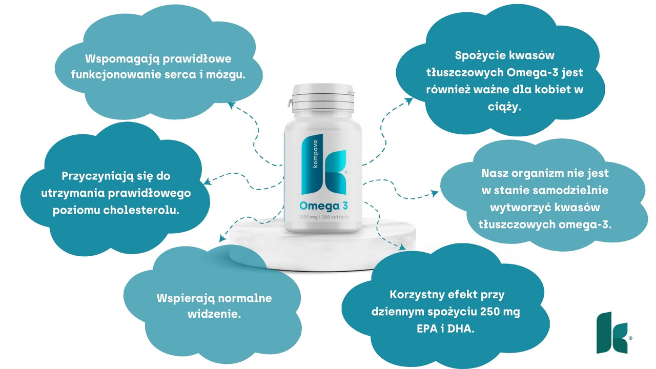 Kwasy Omega-3 to tłuszcze, które są niezbędne do prawidłowego funkcjonowania organizmu. Występują głównie w tłustych rybach morskich. Nasz organizm nie jest w stanie samodzielnie wytworzyć kwasów omega-3, dlatego konieczne jest ciągłe uzupełnianie ich poziomu w organizmie. Najnowsze badania pokazują, że większość populacji ma niedobór kwasów tłuszczowych omega-3. Kwasy tłuszczowe omega-3 składają się z kwasu eikozapentaenowego (EPA) i kwasu dokozaheksaenowego (DHA). Dla organizmu człowieka te dwa kwasy tłuszczowe są absolutnie niezbędne, a ich niedobór prowadzi do zwyrodnień.