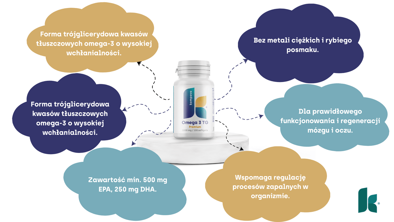 Omega 3 TG Premium zawiera kwasy tłuszczowe omega-3 EPA i DHA, które są naturalnym składnikiem diety pochodzącej ze źródeł morskich. EPA to składnik biorący udział w różnych procesach zachodzących w organizmie, w tym w reakcjach związanych z mechanizmami zapalnymi. DHA jest ważnym elementem budowy mózgu, oczu i błon komórkowych. Ich regularne i wystarczające spożycie wiąże się z lepszą regeneracją, stabilnością naczyń krwionośnych, prawidłową odpowiedzią układu odpornościowego i wsparciem odporności psychicznej. Dlatego spożywanie wysokiej jakości omega-3 w postaci koncentratu TG jest ważne jako aktywne wsparcie żywieniowe w okresach wzmożonego stresu lub w okresach wzrostu i starzenia. Forma Omega-3 TG stanowi optymalny sposób na zapewnienie skutecznej i dobrze tolerowanej podaży tych niezbędnych substancji w codziennej diecie.