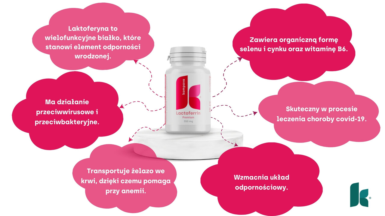 Laktoferyna jest wielofunkcyjnym białkiem, które należy do grupy transferynów – pierwiastków śladowych we krwi (miedzi, żelaza, cynku). Występuje naturalnie w organizmie człowieka. W niewielkich ilościach jest zawarta we wszystkich płynach ustrojowych (np. ślina, łzy) i jest częścią odporności wrodzonej. Dodatkowo w składzie znajduje się organiczna forma selenu i cynku, które przyczyniają się do prawidłowego funkcjonowania układu odpornościowego. Witamina B6 przyczynia się do prawidłowego metabolizmu ważnego dla produkcji energii i prawidłowej produkcji czerwonych krwinek.
