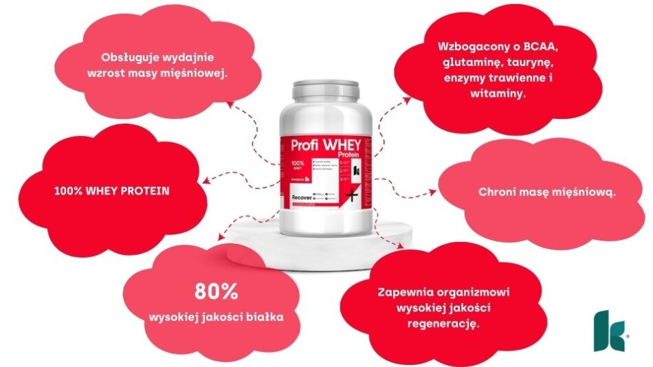 Protein PROFI Whey zostało opracowane, aby osiągnąć pożądane cele fitness. Zawiera 100% białka serwatkowego, a dzięki wysokiej zawartości białka oraz minimalnej zawartości węglowodanów i tłuszczów idealnie sprawdzi się w diecie. Aminokwasy l-glutaminy oraz BCAA znacząco przyczynia się do szybszej regeneracji mięśni. Zawarty w białku Profi Whey kompleks enzymów poprawia jego wchłanianie, a także zapobiega wzdęciom. Nadaje się również dla diabetyków.
