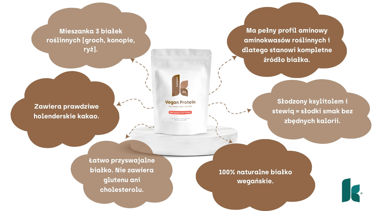 Białko wegańskie zawiera kombinację trzech białek roślinnych z grochu, ryżu i konopi. Białka roślinne są typowe, ponieważ brakuje im niektórych aminokwasów = nie mają pełnego profilu aminowego. Połączenie konopi, grochu i ryżu zapewnia, że Vegan Protein ma pełny profil aminowy aminokwasów pochodzenia roślinnego, co czyni go kompletnym źródłem białka. Skład wzbogacono o roślinne BCAA, które wspomagają wzrost i regenerację mięśni.