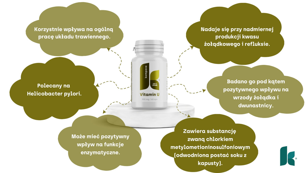 Substancja zwana witaminą U może korzystnie wpływać na funkcje enzymatyczne oraz wspomagać pracę układu trawiennego, zwłaszcza żołądka. Ten naturalny składnik występuje naturalnie w produktach spożywczych, takich jak kapusta, zielone warzywa liściaste i żółtko jaja. Ponadto na podstawie przeprowadzonych badań przez dr. Garnett Cheney, witamina U może przyczynić się do ochrony błony śluzowej żołądka i może wspierać ogólną funkcję układu trawiennego (1). Witamina U uważana jest za naturalny suplement diety, który może wzmocnić układ odpornościowy i może wesprzeć funkcje detoksykacyjne organizmu oraz obniżyć poziom tłuszczu i cholesterolu we krwi.
