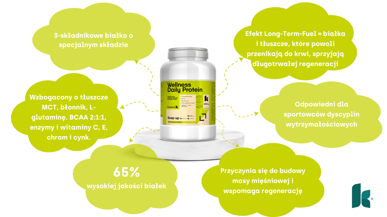 Wellness Protein ma za zadanie uzupełniać organizm we wszystkie niezbędne substancje z naciskiem na maksymalną efektywność i użyteczność w organizmie. Pomaga osiągnąć cele w postaci wyrzeźbionej sylwetki i zbilansowanego stylu życia. Zawiera 3 rodzaje białek, tłuszcze MCT, błonnik, L-glutaminę, BCAA 2:1:1, enzymy oraz witaminy C, E, chrom. Zapewnia wystarczającą i długoterminową podaż wszystkich substancji niezbędnych do prawidłowego funkcjonowania organizmu. Dzięki składnikom oraz witaminom C i E cynk wspiera prawidłowe funkcjonowanie układu odpornościowego. Jego skład nie ma konkurencji na rynku, a połączenie substancji pozytywnie wpływa na prawidłowe funkcjonowanie organizmu.